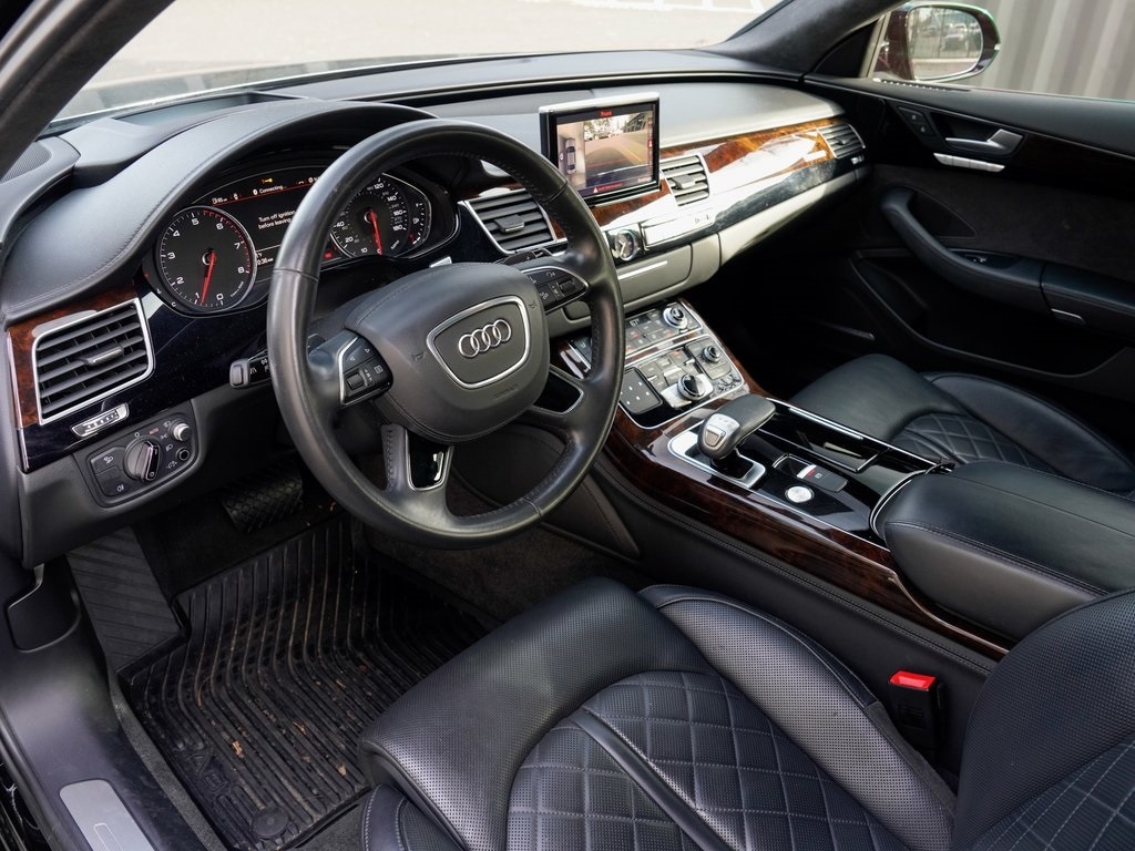 Audi Beaverton offers this 2018 Mythos Black Metallic Audi A8 L 4.0T Sport AWD. It is well equipped and includes these features and benefits: Black w/Valcona Leather Seat Upholstery, 14 Speakers, 22-Way Power Heated Front Comfort Sport Seats, 4-Wheel Disc Brakes, ABS brakes, Adaptive suspension, Air Conditioning, Alloy wheels, AM/FM radio: SiriusXM, Auto tilt-away steering wheel, Auto-dimming door mirrors, Auto-dimming Rear-View mirror, Auto-leveling suspension, Automatic temperature control, Bose Surround Sound System w/AudioPilot, Brake assist, Bumpers: body-color, CD player, Compass, Delay-off headlights, Door auto-latch, Driver door bin, Driver vanity mirror, Dual front impact airbags, Dual front side impact airbags, DVD-Audio, Electronic Stability Control, Exterior Parking Camera Rear, Four wheel independent suspension, Front anti-roll bar, Front Bucket Seats, Front dual zone A/C, Front fog lights, Front reading lights, Garage door transmitter: HomeLink, Genuine wood console insert, Head restraints memory, Headlight cleaning, Heads-Up Display, Heated door mirrors, Heated front seats, Heated rear seats, HVAC memory, Illuminated entry, Knee airbag, Leather Shift Knob, Leather steering wheel, Low tire pressure warning, Memory seat, Navigation System, Occupant sensing airbag, Outside temperature display, Overhead airbag, Overhead console, Panic alarm, Passenger door bin, Passenger vanity mirror, Power 2nd-Row Moonroof, Power adjustable front head restraints, Power door mirrors, Power driver seat, Power moonroof, Power passenger seat, Power steering, Power windows, Radio data system, Radio: Audi MMI Navigation Plus System, Rain sensing wipers, Rear air conditioning, Rear anti-roll bar, Rear dual zone A/C, Rear fog lights, Rear reading lights, Rear seat center armrest, Rear side impact airbag, Rear Window Blind, Rear window defroster, Remote keyless entry, Seatbelt memory, Security system, Speed control, Speed-Sensitive Wipers, Steering wheel memory, Steering wheel mounted audio controls, Tachometer, Telescoping steering wheel, Tilt steering wheel, Traction control, Trip computer, Turn signal indicator mirrors, Valcona Leather Seat Upholstery, Variably intermittent wipers, Ventilated front seats, and Wheels: 9" x 20" 5-Spoke-Blade-Design. Bluetooth, Black w/Valcona Leather Seat Upholstery.