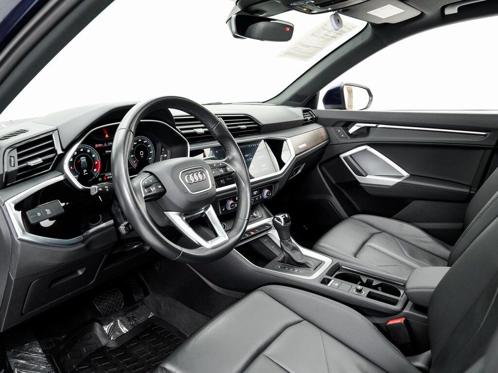 Audi Beaverton offers this 2022 Navarra Blue Metallic Audi Q3 Premium Plus AWD. It is well equipped and includes these features and benefits: 10 Speakers, 3.533 Axle Ratio, 4-Wheel Disc Brakes, ABS brakes, Air Conditioning, Alloy wheels, AM/FM radio, Audi smartphone interface (Apple CarPlay/Android Auto), Auto High-beam Headlights, Automatic temperature control, Brake assist, Bumpers: body-color, Delay-off headlights, Driver door bin, Driver vanity mirror, Dual front impact airbags, Dual front side impact airbags, Electronic Stability Control, Emergency communication system: Audi connect CARE, Exterior Parking Camera Rear, Four wheel independent suspension, Front anti-roll bar, Front Bucket Seats, Front Center Armrest, Front dual zone A/C, Front fog lights, Front reading lights, Fully automatic headlights, Heated door mirrors, Heated Front Bucket Seats, Heated front seats, Illuminated entry, Knee airbag, Leather Seating Surfaces, Leather Shift Knob, Leather steering wheel, Low tire pressure warning, Occupant sensing airbag, Outside temperature display, Overhead airbag, Overhead console, Panic alarm, Passenger door bin, Passenger vanity mirror, Power door mirrors, Power driver seat, Power Liftgate, Power moonroof: Panoramic, Power passenger seat, Power steering, Power windows, Radio data system, Radio: Audi Sound System, Rain sensing wipers, Rear air conditioning, Rear anti-roll bar, Rear fog lights, Rear reading lights, Rear seat center armrest, Rear window defroster, Rear window wiper, Remote keyless entry, Speed control, Speed-sensing steering, Split folding rear seat, Spoiler, Steering wheel mounted audio controls, Tachometer, Telescoping steering wheel, Tilt steering wheel, Traction control, Trip computer, Turn signal indicator mirrors, Variably intermittent wipers, and Wheels: 18" 5-V-Spoke-S Design. Bluetooth.