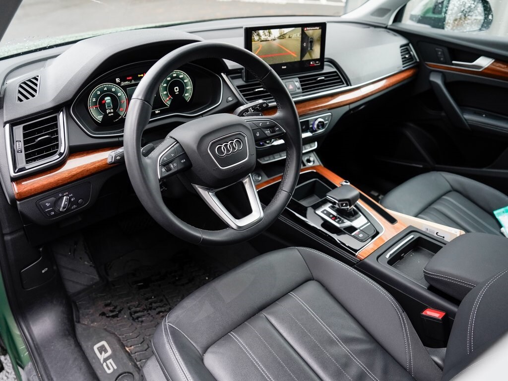 Audi Beaverton offers this 2022 District Green Metallic Audi Q5 45 S line Premium AWD. It is well equipped and includes these features and benefits: Black Optic Package (Black Exterior Trim, Black Roof Rails, and Wheels: 20" 5-Arm Cutter Design, Bi-Color Finish), Convenience Package (Audi Advanced Key, Auto-Dimming Power Folding Exterior Mirrors, Driver Seat Memory, Heated Steering Wheel, and SiriusXM All Access Service), Navigation Package (Audi Connect PRIME & PLUS and MMI Navigation Plus), Premium Plus Package (Adaptive Cruise Control w/Traffic Jam Assist, Audi Active Lane Assist, Audi Phone Box, Audi Virtual Cockpit Plus, Hands-On Detection Steering Wheel, Leatherette Covered Center Console & Door Armrests, Panoramic Sunroof, Power Adjustable Steering Column, Top View Camera System, and Wheels: 19" 5-Double-Arm Design Bi-Color Finish), Black Leather, 10 Speakers, 4-Wheel Disc Brakes, 5.302 Axle Ratio, ABS brakes, Air Conditioning, All-Weather Floor Mats, Alloy wheels, AM/FM radio, Audi Beam-Rings, Audi Guard Protection Kit, Audi Phone Box Delete, Auto High-beam Headlights, Auto-dimming Rear-View mirror, Automatic temperature control, Bang & Olufsen Sound System w/3D Sound, Black Audi Rings & Badges, Brake assist, Bumpers: body-color, Cargo Mat, Compass, Delay-off headlights, Driver door bin, Driver vanity mirror, Dual front impact airbags, Dual front side impact airbags, Electronic Stability Control, Emergency communication system: Audi connect CARE, Exterior Parking Camera Rear, Four wheel independent suspension, Front anti-roll bar, Front Bucket Seats, Front Center Armrest, Front dual zone A/C, Front fog lights, Front reading lights, Garage door transmitter: HomeLink, Genuine wood console insert, Genuine wood dashboard insert, Genuine wood door panel insert, Heated 8-Way Power Front Bucket Seats, Heated door mirrors, Heated front seats, Illuminated entry, Leather Seating Surfaces, Leather Shift Knob, Low tire pressure warning, Occupant sensing airbag, Outside temperature display, Overhead airbag, Overhead console, Panic alarm, Passenger door bin, Passenger vanity mirror, Power door mirrors, Power driver seat, Power Liftgate, Power passenger seat, Power steering, Power windows, Radio data system, Radio: Audi Sound System, Rain sensing wipers, Rear air conditioning, Rear anti-roll bar, Rear fog lights, Rear reading lights, Rear seat center armrest, Rear window defroster, Rear window wiper, Remote keyless entry, Roof rack, Security system, Speed control, Speed-sensing steering, Speed-Sensitive Wipers, Split folding rear seat, Spoiler, Steering wheel mounted audio controls, Tachometer, Telescoping steering wheel, Tilt steering wheel, Traction control, Trailer Hitch, Trip computer, Turn signal indicator mirrors, Variably intermittent wipers, and Wheels: 18" 5-Arm-Star Design. Bluetooth, Black Leather.