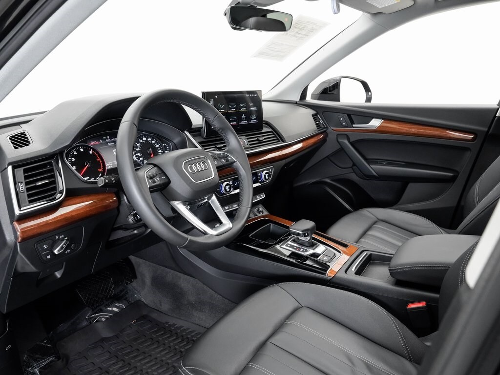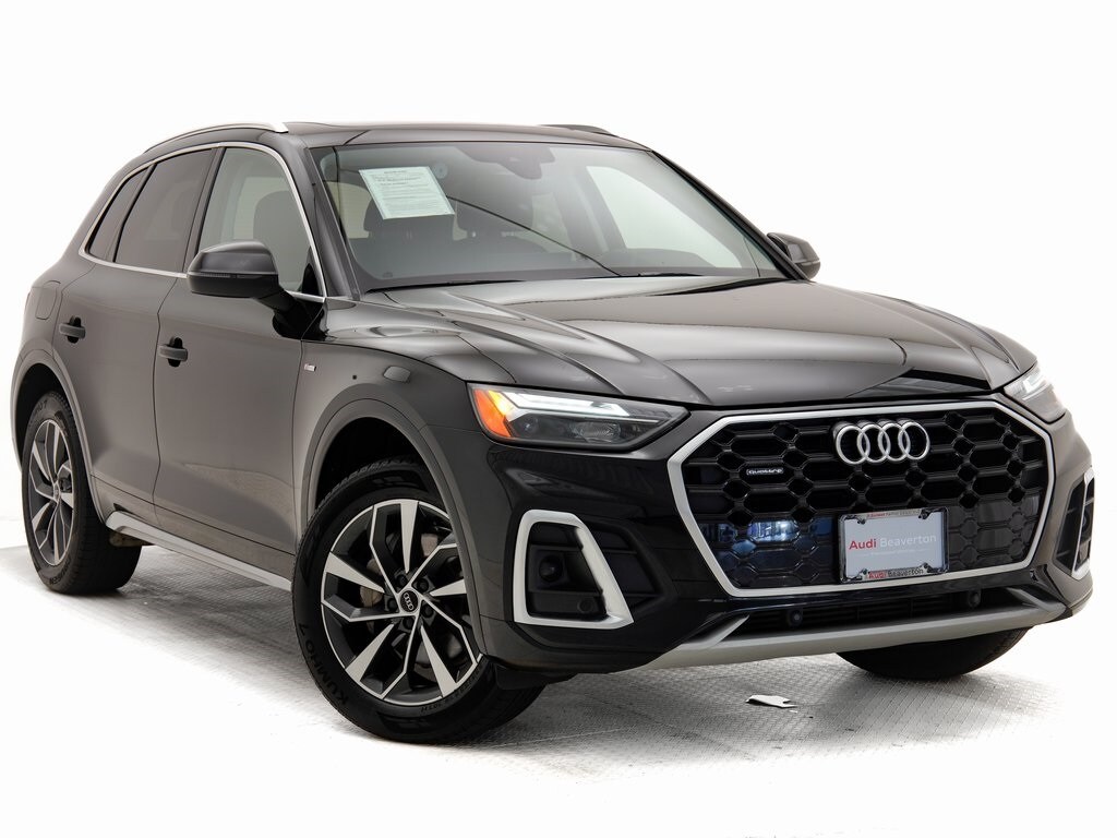 Audi Beaverton offers this 2022 Mythos Black Metallic Audi Q5 45 S line Premium AWD. It is well equipped and includes these features and benefits: Black w/Leather Seating Surfaces, 10 Speakers, 4-Wheel Disc Brakes, 5.302 Axle Ratio, ABS brakes, Air Conditioning, Alloy wheels, AM/FM radio, Auto High-beam Headlights, Auto-dimming Rear-View mirror, Automatic temperature control, Brake assist, Bumpers: body-color, Compass, Delay-off headlights, Driver door bin, Driver vanity mirror, Dual front impact airbags, Dual front side impact airbags, Electronic Stability Control, Emergency communication system: Audi connect CARE, Exterior Parking Camera Rear, Four wheel independent suspension, Front anti-roll bar, Front Bucket Seats, Front Center Armrest, Front dual zone A/C, Front fog lights, Front reading lights, Garage door transmitter: HomeLink, Genuine wood console insert, Genuine wood dashboard insert, Genuine wood door panel insert, Heated 8-Way Power Front Bucket Seats, Heated door mirrors, Heated front seats, Illuminated entry, Leather Seating Surfaces, Leather Shift Knob, Low tire pressure warning, Occupant sensing airbag, Outside temperature display, Overhead airbag, Overhead console, Panic alarm, Passenger door bin, Passenger vanity mirror, Power door mirrors, Power driver seat, Power Liftgate, Power passenger seat, Power steering, Power windows, Radio data system, Radio: Audi Sound System, Rain sensing wipers, Rear air conditioning, Rear anti-roll bar, Rear fog lights, Rear reading lights, Rear seat center armrest, Rear window defroster, Rear window wiper, Remote keyless entry, Roof rack, Security system, Speed control, Speed-sensing steering, Speed-Sensitive Wipers, Split folding rear seat, Spoiler, Steering wheel mounted audio controls, Tachometer, Telescoping steering wheel, Tilt steering wheel, Traction control, Trip computer, Turn signal indicator mirrors, Variably intermittent wipers, and Wheels: 18" 5-Arm-Star Design. Bluetooth, Black w/Leather Seating Surfaces.