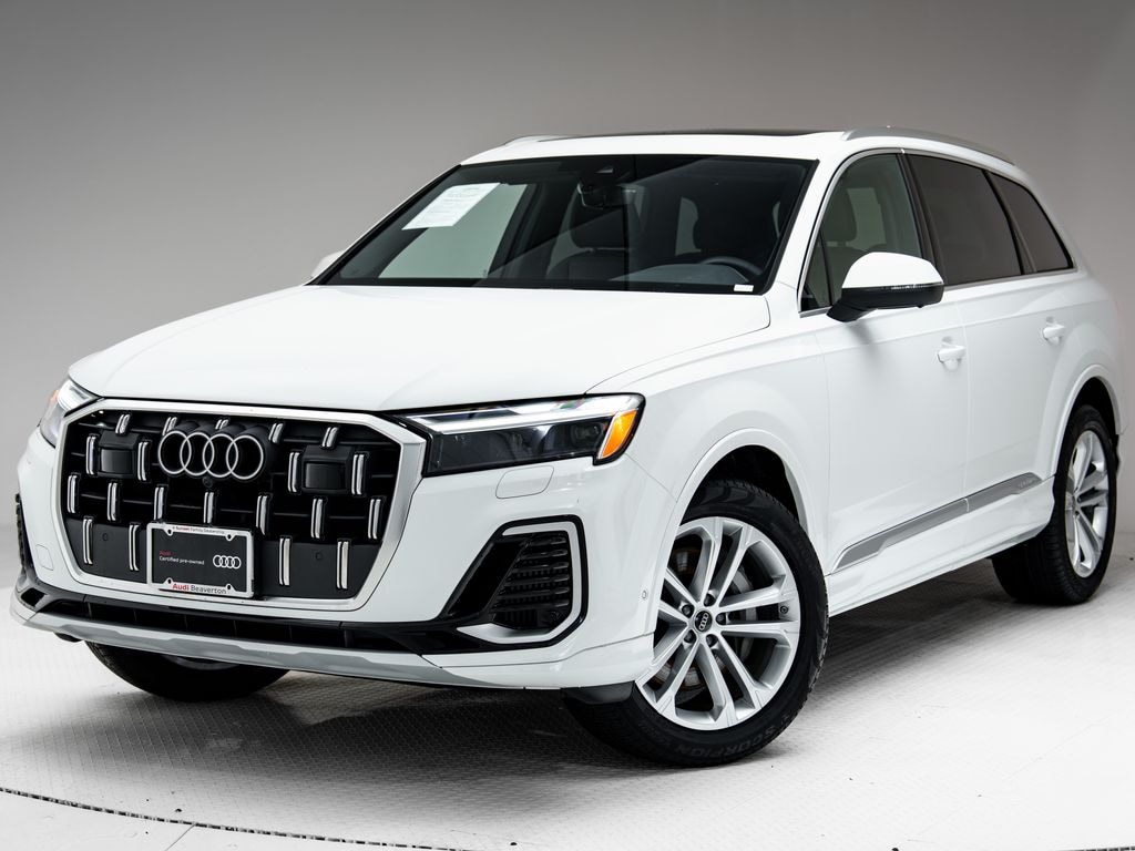 Audi Beaverton offers this 2025 Carrara White Audi Q7 55 Premium AWD. It is well equipped and includes these features and benefits: Convenience Package (Heated Steering Wheel, Top View Camera System, and Wireless Phone Charging Pad), Audi Certified pre-owned Certified, 10 Speakers, 3rd row seats: bench, 4-Wheel Disc Brakes, 7-Pin Adapter, ABS brakes, Air Conditioning, Alloy wheels, Audi Beam Rings, Audi Guard Protection Kit, Auto High-beam Headlights, Auto-dimming door mirrors, Auto-dimming Rear-View mirror, Automatic temperature control, Brake assist, Bumpers: body-color, Compass, Delay-off headlights, Driver door bin, Driver vanity mirror, Dual front impact airbags, Dual front side impact airbags, Electronic Stability Control, Emergency communication system: Audi connect CARE, Exterior Parking Camera Rear, Four wheel independent suspension, Front anti-roll bar, Front Bucket Seats, Front Center Armrest, Front dual zone A/C, Front fog lights, Front reading lights, Fully automatic headlights, Garage door transmitter: HomeLink, Genuine wood door panel insert, Heated door mirrors, Heated Front Bucket Seats, Heated front seats, Illuminated entry, Leather Seating Surfaces, Leather Shift Knob, Leather steering wheel, Low tire pressure warning, Memory seat, Navigation system: Audi MMI Navigation plus with Touch Response, Occupant sensing airbag, Outside temperature display, Overhead airbag, Overhead console, Panic alarm, Passenger door bin, Passenger vanity mirror, Power door mirrors, Power driver seat, Power Liftgate, Power moonroof: Panoramic, Power passenger seat, Power Soft-Closing Doors, Power steering, Power windows, Privacy Trunk Cover, Radio data system, Radio: Audi Sound System, Rain sensing wipers, Rear air conditioning, Rear anti-roll bar, Rear fog lights, Rear reading lights, Rear seat center armrest, Rear side impact airbag, Rear window defroster, Rear window wiper, Reclining 3rd row seat, Remote keyless entry, Security system, Speed control, Speed-sensing steering, Split folding rear seat, Spoiler, Steering wheel memory, Steering wheel mounted audio controls, Tachometer, Telescoping steering wheel, Tilt steering wheel, Traction control, Trailer Hitch, Trip computer, Turn signal indicator mirrors, Variably intermittent wipers, Wheels: 19" 5-Arm-Star Design, and Wheels: 20" 5-Double-Spoke. Bluetooth.
