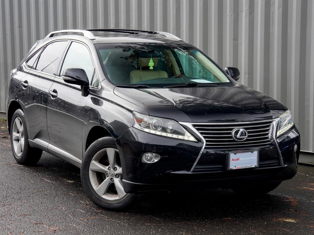 Audi Beaverton offers this 2014 Black Lexus RX 350 AWD. It is well equipped and includes these features and benefits: AWD, 18" x 7.5" 5-Spoke Aluminum Wheels, 4-Wheel Disc Brakes, 4.398 Axle Ratio, 9 Speakers, ABS brakes, Air Conditioning, Alloy wheels, AM/FM radio: SiriusXM, Anti-whiplash front head restraints, Auto-dimming door mirrors, Auto-dimming Rear-View mirror, Automatic temperature control, Bluetooth® Hands-Free Phone, Brake assist, Bumpers: body-color, CD player, Compass, Delay-off headlights, Driver door bin, Driver vanity mirror, Dual front impact airbags, Dual front side impact airbags, Electronic Stability Control, Emergency communication system: Safety Connect, Fabric Seat Trim, Four wheel independent suspension, Front anti-roll bar, Front Bucket Seats, Front Center Armrest, Front dual zone A/C, Front fog lights, Front reading lights, Fully automatic headlights, Garage door transmitter: HomeLink, Genuine wood console insert, Genuine wood door panel insert, Heated door mirrors, Illuminated entry, Knee airbag, Leather Seat Trim, Low tire pressure warning, Occupant sensing airbag, Outside temperature display, Overhead airbag, Overhead console, Panic alarm, Passenger door bin, Passenger vanity mirror, Power door mirrors, Power driver seat, Power Liftgate, Power passenger seat, Power steering, Power windows, Radio data system, Radio: Prem AM/FM Audio w/Single CD Player, Rear anti-roll bar, Rear reading lights, Rear seat center armrest, Rear side impact airbag, Rear window defroster, Rear window wiper, Remote keyless entry, Security system, Speed control, Speed-sensing steering, Split folding rear seat, Spoiler, Steering wheel mounted audio controls, Tachometer, Telescoping steering wheel, Tilt steering wheel, Traction control, Trip computer, Turn signal indicator mirrors, and Variably intermittent wipers. Bluetooth, AWD.