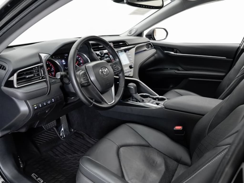 Porsche Beaverton offers this 2019 Midnight Black Metallic Toyota Camry XSE V6 FWD. It is well equipped and includes these features and benefits: Black w/Quilted Perforated Leather Seat Trim, ABS brakes, Active Cruise Control, Alloy wheels, Compass, Electronic Stability Control, Front dual zone A/C, Heated door mirrors, Heated front seats, Illuminated entry, Low tire pressure warning, Perforated Leather Seat Trim, Power moonroof, Remote keyless entry, Traction control, 4-Wheel Disc Brakes, 9 Speakers, Air Conditioning, AM/FM radio: SiriusXM, Apple CarPlay, Auto High-beam Headlights, Auto-dimming Rear-View mirror, Automatic temperature control, Brake assist, Bumpers: body-color, CD player, Delay-off headlights, Driver door bin, Driver vanity mirror, Dual front impact airbags, Dual front side impact airbags, Emergency communication system: Safety Connect, Exterior Parking Camera Rear, Four wheel independent suspension, Front anti-roll bar, Front Bucket Seats, Front Center Armrest, Front reading lights, Fully automatic headlights, Garage door transmitter: HomeLink, Heads-Up Display, Knee airbag, Leather Shift Knob, Multi-Stage Heated Front Bucket Seats, Occupant sensing airbag, Outside temperature display, Overhead airbag, Overhead console, Panic alarm, Passenger door bin, Passenger vanity mirror, Power door mirrors, Power driver seat, Power passenger seat, Power steering, Power windows, Radio data system, Radio: Entune 3.0 Audio Plus w/JBL w/Clari-Fi, Rear anti-roll bar, Rear reading lights, Rear seat center armrest, Rear side impact airbag, Rear window defroster, Security system, Speed control, Speed-sensing steering, Split folding rear seat, Spoiler, Sport steering wheel, Steering wheel mounted audio controls, Tachometer, Telescoping steering wheel, Tilt steering wheel, Trip computer, Turn signal indicator mirrors, Variably intermittent wipers, and Wheels: 8.0J x 19" Black Machined-Finish Alloy. Black w/Quilted Perforated Leather Seat Trim, ABS brakes, Active Cruise Control, Alloy wheels, Compass, Electronic Stability Control, Front dual zone A/C, Heated door mirrors, Heated front seats, Illuminated entry, Low tire pressure warning, Perforated Leather Seat Trim, Power moonroof, Remote keyless entry, Traction control.