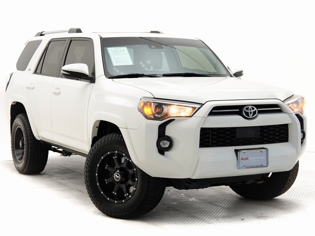 Audi Beaverton offers this 2022 White Toyota 4Runner SR5 Premium 4WD. It is well equipped and includes these features and benefits: 4WD, 17" 6-Spoke Alloy Wheels, 3.727 Axle Ratio, 4-Wheel Disc Brakes, 8 Speakers, ABS brakes, Air Conditioning, Alloy wheels, AM/FM radio: SiriusXM, Anti-whiplash front head restraints, Apple CarPlay/Android Auto, Auto High-beam Headlights, Auto-dimming Rear-View mirror, Blind Spot Monitor (BSM), Brake assist, Bumpers: body-color, Compass, Driver door bin, Driver vanity mirror, Dual front impact airbags, Dual front side impact airbags, Electronic Stability Control, Emergency communication system: Safety Connect with 1-year trial, Exterior Parking Camera Rear, Front anti-roll bar, Front Bucket Seats, Front Center Armrest, Front fog lights, Front reading lights, Front wheel independent suspension, Garage Door Opener, Garage door transmitter: HomeLink, Heated door mirrors, Heated Front Bucket Seats, Heated front seats, Illuminated entry, Knee airbag, Leather Shift Knob, Leather steering wheel, Low tire pressure warning, Occupant sensing airbag, Outside Rear View Mirror, Outside temperature display, Overhead airbag, Overhead console, Panic alarm, Passenger door bin, Passenger vanity mirror, Power door mirrors, Power driver seat, Power passenger seat, Power steering, Power windows, Radio: Premium Audio w/Dynamic Navigation, Rear anti-roll bar, Rear seat center armrest, Rear window defroster, Rear window wiper, Remote keyless entry, Roof rack: rails only, Security system, SofTex Seat Trim, Speed control, Speed-sensing steering, Split folding rear seat, Spoiler, Steering wheel mounted audio controls, Tachometer, Telescoping steering wheel, Tilt steering wheel, Traction control, Trip computer, Turn signal indicator mirrors, and Variably intermittent wipers. Bluetooth, 4WD.