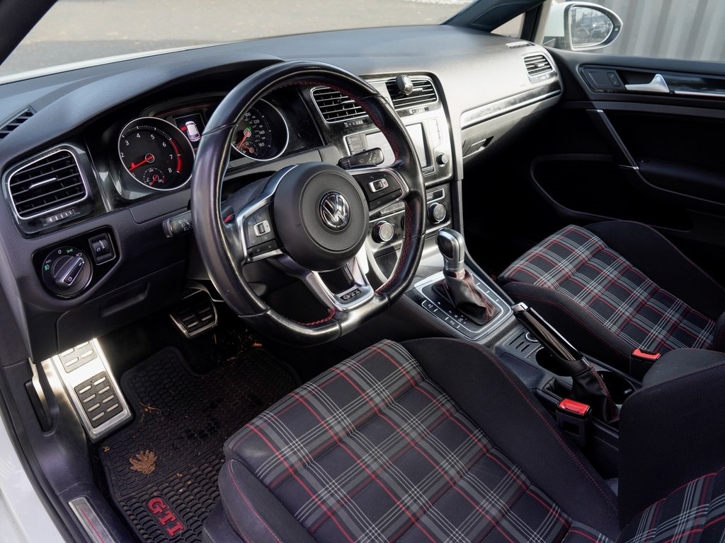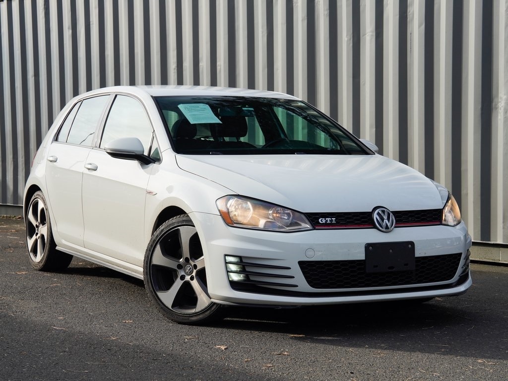 Audi Beaverton offers this 2017 White Volkswagen Golf GTI S FWD. It is well equipped and includes these features and benefits: 4-Wheel Disc Brakes, 8 Speakers, ABS brakes, Air Conditioning, Alloy wheels, AM/FM radio: SiriusXM, Anti-whiplash front head restraints, Brake assist, Bumpers: body-color, CD player, Cloth Seating Surfaces, Compass, Driver door bin, Driver vanity mirror, Dual front impact airbags, Dual front side impact airbags, Electronic Stability Control, Emergency communication system: VW Car-Net, Exterior Parking Camera Rear, Four wheel independent suspension, Front anti-roll bar, Front Bucket Seats, Front Center Armrest, Front fog lights, Front reading lights, Heated door mirrors, Heated front seats, Heated Top Sport Front Seats, Illuminated entry, Leather Shift Knob, Leather steering wheel, Low tire pressure warning, Occupant sensing airbag, Outside temperature display, Overhead airbag, Overhead console, Panic alarm, Passenger door bin, Passenger vanity mirror, Power door mirrors, Power driver seat, Power passenger seat, Power steering, Power windows, Radio data system, Radio: Composition Media w/6.5" Touchscreen, Rear anti-roll bar, Rear reading lights, Rear seat center armrest, Rear window defroster, Rear window wiper, Remote keyless entry, Security system, Speed control, Speed-sensing steering, Split folding rear seat, Spoiler, Sport steering wheel, Steering wheel mounted audio controls, Tachometer, Telescoping steering wheel, Tilt steering wheel, Traction control, Trip computer, Turn signal indicator mirrors, Variably intermittent wipers, and Wheels: 18" Austin Alloy. Bluetooth.